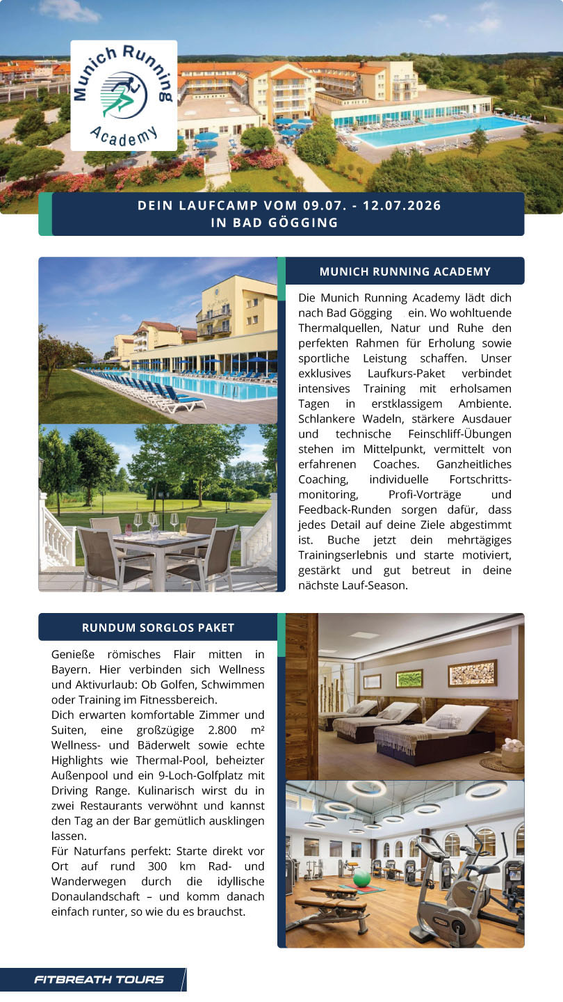 Die Munich Running Academy lädt dich nach Bad Gögging ein. Wo wohltuende Thermalquellen, Natur und Ruhe den perfekten Rahmen für Erholung sowie sportliche Leistung schaffen. Unser exklusives Laufkurs-Paket verbindet intensives Training mit erholsamen Tagen in erstklassigem Ambiente. Schlankere Wadeln, stärkere Ausdauer und technische Feinschliff-Übungen stehen im Mittelpunkt, vermittelt von erfahrenen Coaches. Ganzheitliches Coaching, individuelle Fortschrittsmonitoring, Profi-Vorträge und